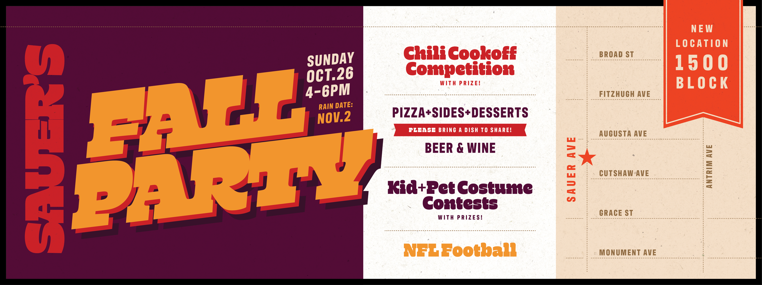 We're excited to see you all at this year's Fall Block Party hosted by Sauer's Gardens! We'll welcome back the chili cookoff (with a grand prize for the best chili), costume contests, and so much more.